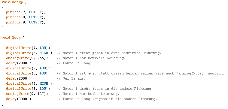 Die Datei sollte unter 'Eigene Dateien, Arduino, Bsp_Motoren' abgespeichert werden.