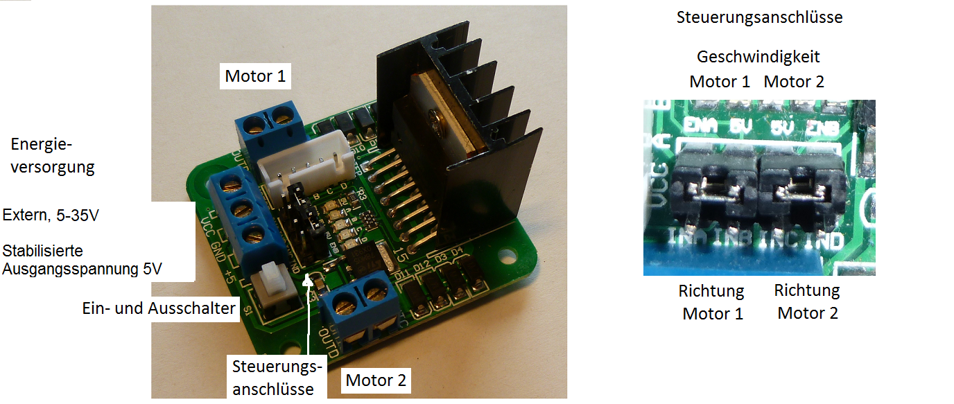 ENA (Geschwindigkeit, digitaler PWM-Ausgang beim Arduino-Board). Bleibt die Brücke zwischen ENA und 5V drinnen, dann läuft der Motor mit voller Kraft.
